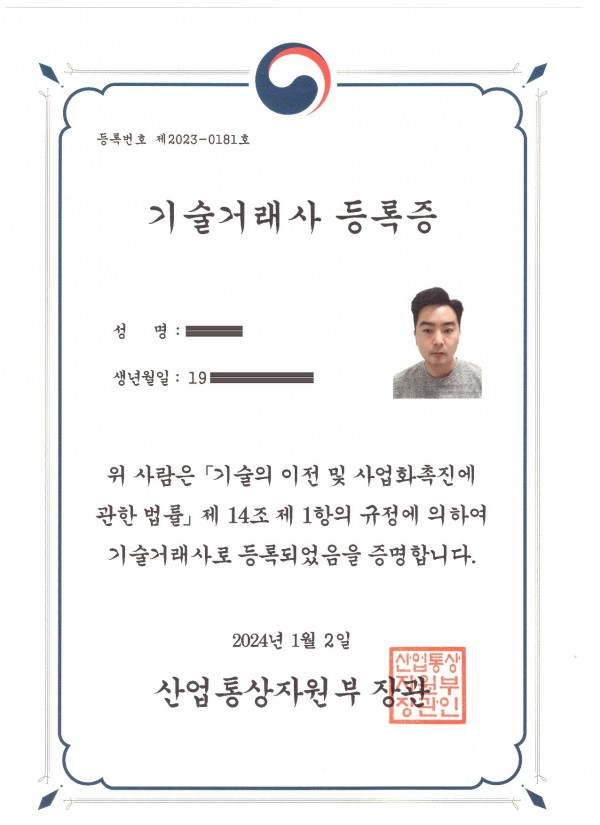 한국IT평가법인 키아라 대표 감정인은 2024년 1월 국가공인 기술거래사 자격을 취득하였습니다.